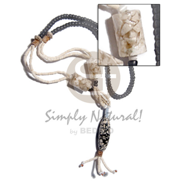 3 rows glass beads and wood ricebeads combination with round 65mm laminated coco with brownlip crack..