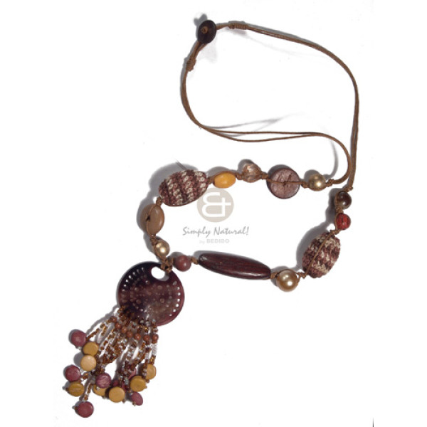 2 3 coco heishe dark tan with rosewood beads, buri nuggets and 35mm scallop brownlip pendant..