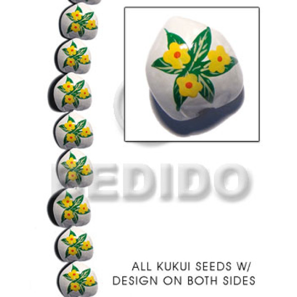 kukui seed white with flower design on 2 sides 16 pcs. per strand..