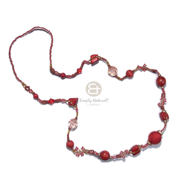 dark red and amber glass beads with matching dark red wood beads, acrylic crystals combination 32in..