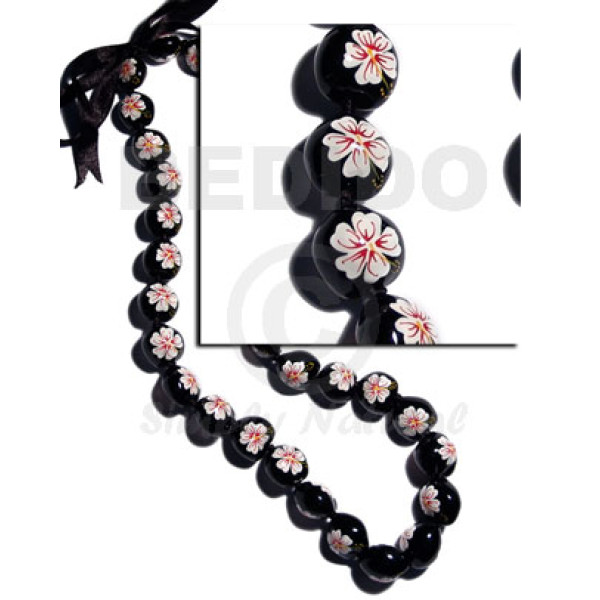 lei black kukui seeds with handpainted white and red flowers 32 pcs 34 in.adjustable..